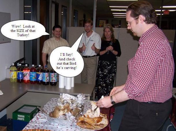 Ah, charming. The "Look out Stomach, here it comes!" part really showed your appreciation for God's Bounty. I'll have to remember that one. No, don't worry, we've already made you a plate. Yes, yes. Here you go. You've got it all... here's the cranberry sauce, jellied like you like it, and still in the appetizing shape of a tin can. Ah! Of course the broccoli, cauliflower and Brussels sprouts all in a sea of pasteurized, processed cheese food. Here's a little stuffing for you, not too dry! Mashed potatoes (with a pinch of garlic), and some rich gravy... that covers it. Oh, of course, silly me. I forgot the most important part of a Thanksgiving Feast... the Turkey. Here you go... here's your Turkey!