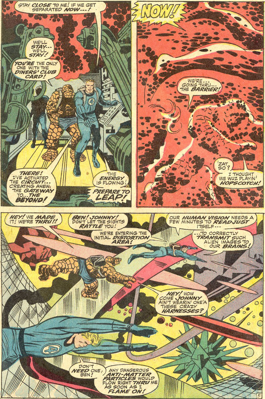 From Fantastic Four Annual #6 (November, 1968). Kirby's art took on a more experimental, detailed and intricate look after he delegated more of his work to other artists and took more time with his drawings. The landmark Fantastic Four Annual #6 is a prime example of this era as well as a unique showcase for his rendering of energy fields in a technique now known as "Kirby Dots". [Dialogue by Stan Lee, Pencil art by Jack Kirby, Inks by Joe Sinnott] |