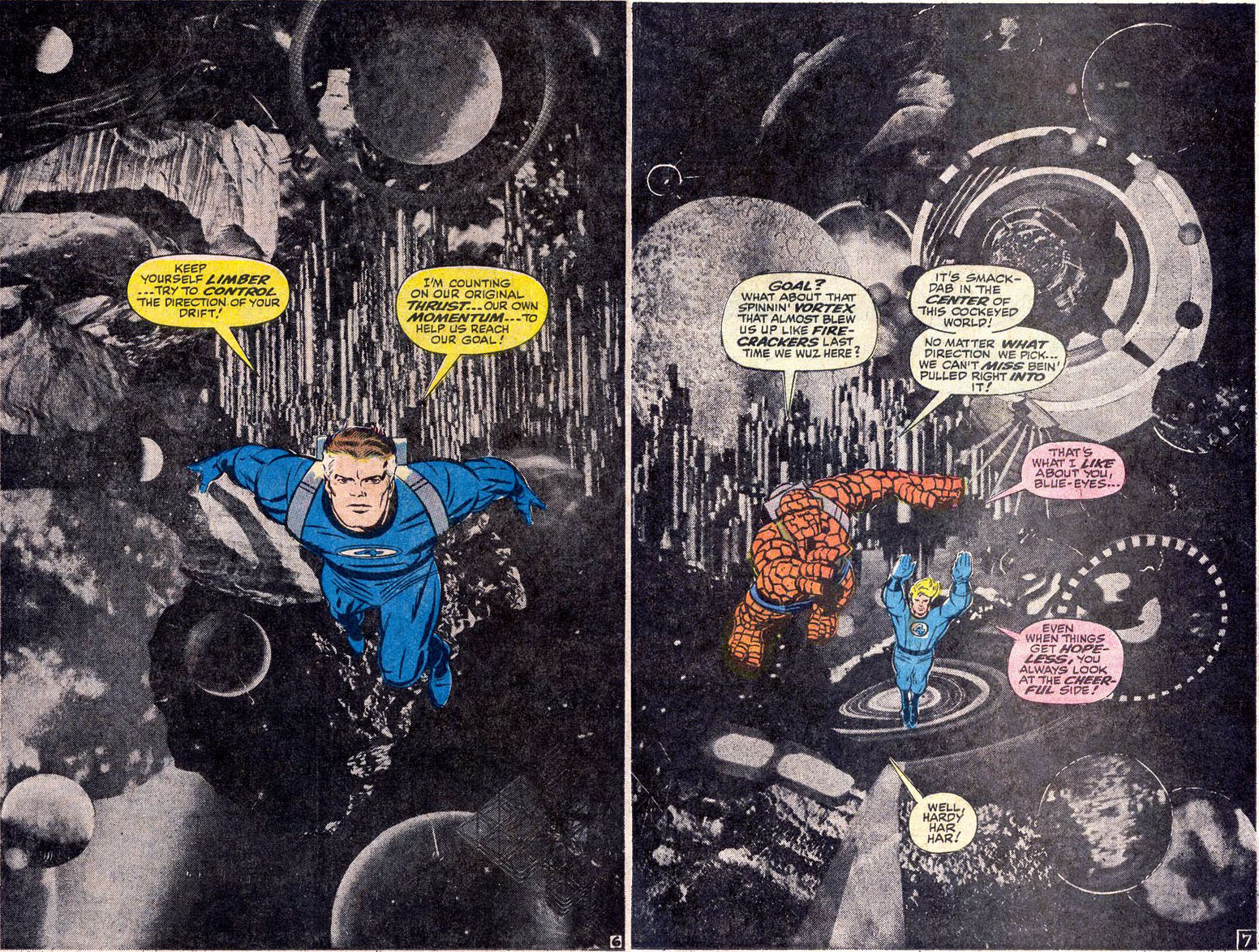 Also from Fantastic Four Annual #6 (November, 1968). Kirby's experimental phase also included work with Photo Collages, such as this one. It's worth noting that this issue was published a few short months after the release of 2001: A Space Odyssey (a saga Kirby would later become a contributor to himself). [Dialogue by Stan Lee, Pencil art by Jack Kirby, Inks by Joe Sinnott] |