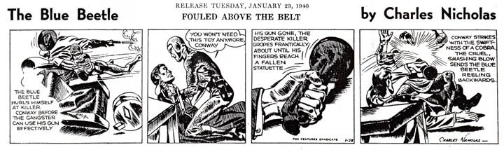 Jack Kirby's first published Superhero work was on The Blue Beetle (published under the pen name "Charles Nicholas". This is a far cry from his later work, but Kirby's use of light and shadow already showed amazing promise. |