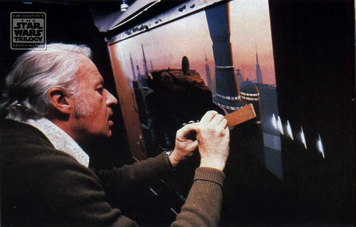 Ralph McQuarrie works on the Matte painting for Cloud City, as seen in The Empire Strikes Back.