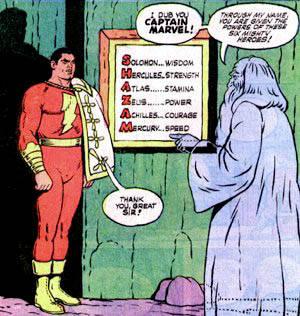 whose publication in Fawcett Comics began only a year after Siegel and Shuster's creation. While kids loved Superman, there was something easy to identify with in the adventures of Captain Marvel. After all, Captain Marvel was a kid too. Young Billy Batson wasn't a grown-up Alien like Superman's Clark Kent. Billy was a little boy from the old US of A who balanced school with a part-time Radio News reporting Job. But when the Wizard named Shazam gave Billy the wisdom of Solomon, the strength of Hercules, the stamina of Atlas, the power of Zeus, the courage of Achilles, and the speed of Mercury, everything changed for Billy! From that point on, any time Billy said one magic word he could become the Superhero Captain Marvel at will. That magic word was "Shazam!" (showing the Wizard had a bit of an ego) and the lightning bolt it summoned was the source of Captain Marvel's change to and from ordinary Billy Batson! The best part? Billy was still Billy even with these godlike powers! What could be better for a kid to read about? Just like the reader, Billy was a young boy, but with only an incantation he could become a god. What's more, Billy the character narrated his own stories, talking to his readers like good buddies he was letting in on a big secret.