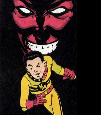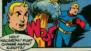 Miller approached the studio of Mick Anglo of Gower Street. Anglo redesigned the Marvel Family into new characters, still similar enough to the originals to keep the Britty Kiddies fascinated. Captain Marvel became Marvelman, young Mickey Moran, who could become the flashy blond superhero with the incantation of one Magic Word: Kimota!, replaced Billy Batson as our hero. "Kimota!" ("atomic" phonetically spelled backward) replaced "Shazam!" just as a technologically advanced astrophysicist's Nuclear Based powers replaced the Wizard's Mystical lightning. The Boy and his Powers weren't alone in the makeover. Captain Marvel Junior/ Freddy Freeman became Young Marvelman/ Dickie Dauntless (stop laughing, kids) and Mary Marvel/ Mary (Bromfeld) Batson got not only a costume change, but a gender-reassignment, becoming Kid Marvelman/ Johnny Bates. Even the Fawcett Villains remained in some revised form or other, notably Dr. Sivana morphing into Dr. Gargunza and Black Adam taking on the guise of Young Nastyman (okay, go ahead and laugh at that one, kids).