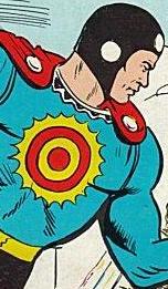 Below: Because THAT version was too original, the character was soon given a red costume with a Yellow symbol on the chest. But at least he didn't walk as a teenager by day until magically summoned during times of trouble... oh, WAIT, he did that too!