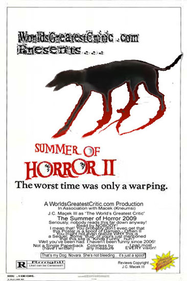 Now, the Summer of Horror returns with a new CHILLING HEAT WAVE! The 2009 Summer of Horror starts on 6.6.9 with Exorcist II: The Heretic, crawls to your aid with Phenomena, sucks away your life like a Parasite, blasts out at you with Jaws 3-D, gives you a red-letter-day triplicate with Graduation Day, Prom Night and My Bloody Valentine which may cause you to hide Beyond the Door, especially as you know that the Horror of Dracula and Bram Stoker's Dracula are wanting to get in to your House for a little Lights, Camera, Dead action to prepare you for your Future-Kill as well as your rides in The Car and The Hearse that might drive you to Dial 'M' for Murder because you're suffering from Vertigo due to those Evils of the Night that offer up Blood for Dracula and all the other Vampyres and Pigs alike all of which suck almost as much as some Attack of the Giant Leeches all of whom are Dressed to Kill like Harry Potter and the Half-Blood Prince (who is a real Bruiser), just ask the Aliens or the Creature from the Haunted Sea who just might take you to the Planet of the Vampires to experience The Haunting that will exceed anything you might expect from Amityville 4 or even La Casa 4 whose Burnt Offerings can scarcely prepare you for La Casa 5 but just might get you ready to say "Let's Scare Jessica to Death!" during your next visit to District 9 for even more of The Haunting, or maybe you'll just say "Happy Birthday to Me!" instead and let the Summer of Horror introduce you to The Legend of Hell House for a real Stir of Echoes before it tells you the Second Story of House II after which you'll be asking for The Sentinel to protect you from Halloween II and Terror Train, which serves no Popcorn even to Frankenstein, The Mummy or Lady Frankenstein in the Dead of Night, embanked in The Fog for a real Night of the Creeps during which you will need The Shining parts of the Summer of Horror which slouches forward toward its monstrous end on 9.9.9 with the possession of Exorcist III, the haunt of Poltergeist and the penultimate nightmare of... THE EXORCIST... that is if there can ever truly be an end to this madness! Don't miss THE SUMMER OF HORROR II: THE ARMAGEDDON!