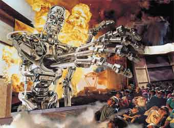 T2: 3-D is a full experience and whether it fits or not with the overall (constantly changing) story, it's a hell of a great ride and well worth seeing. The special effects alone make the trip worthwhile and Stan Winston again has earned his status as a legend in the realm of visual effects and practical props. His work as well as the entire concept of this multimedia show help T2 3-D: Battle Across Time earn a full Four Stars out of Five! All things must come to an end, sadly. The Terminator franchise is now in other hands, for better AND for worse and the great Stan Winston passed away in 2008 before the next entry into the series (2009's Terminator Salvation) was released into theatres. There are plenty of moments that come off as dated here after this many years of operation, but if you can catch it, I highly recommend it. T2 3-D: Battle Across Time will be closing its doors at Universal Studios Hollywood later in 2009 after one decade of showings. Barring naked time travel, this might be your last chance to check it out. See you in the next reel... what ever you're wearing.